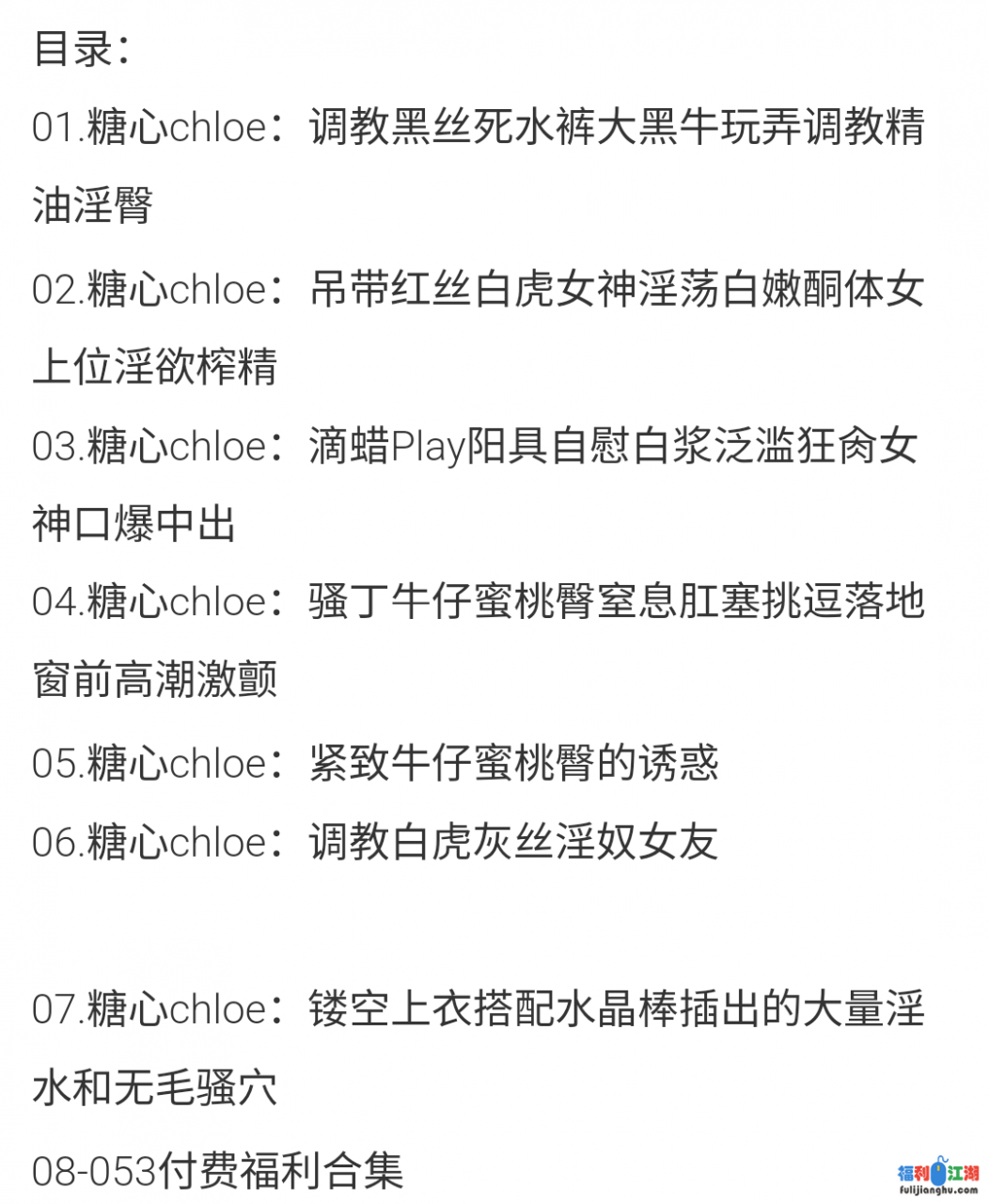 推特网黄顶级美女【ChloePussy69】糖心7部+付费福利合集 [53V44P+12G][百度盘] 2024-01-17 跑车福利 1.48k推特网黄顶级美女【ChloePussy69】糖心7部+付费福利合集 [53V44P+12G][百度盘] 资源下载下载价格8 金币终身VIP免费请先登录此资源购买后1天内可下载。 原文链接:https://svipfuli3.com/1146414.html,转载请注明出处。 0 0网红主播